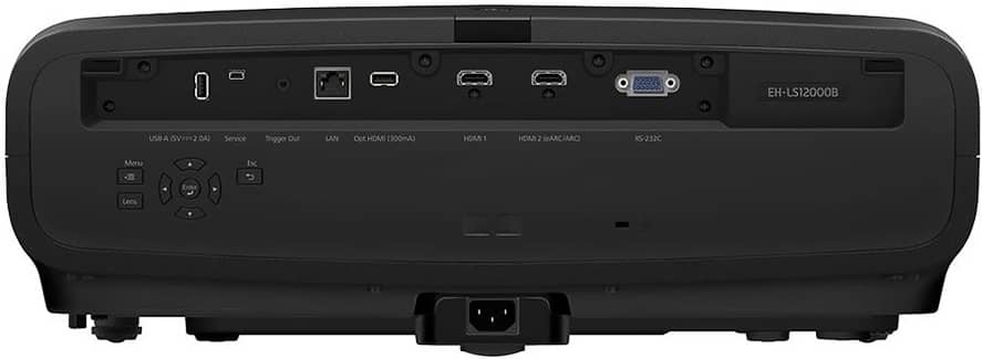 Un panneau de commandes est déporté à l’arrière de l’appareil et permet un accès facile aux différentes connexions. Celles-ci incluent deux entrées HDMI HDCP 2.3, dont eARC/ARC sur la deuxième entrée HDMI. De plus, l’Epson EH-LS12000B dispose d’une entrée USB A, d’une entrée RS232c ainsi que d’un port Ethernet.