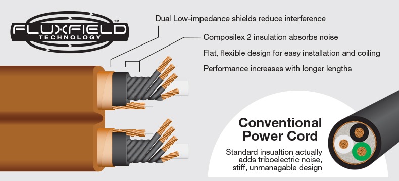 La technologie innovante de Fluxfield ™ de Wireworld est conçue pour absorber les bruits et bloquer les interférences. Cette technologie fournit un son et une image vive. Les câbles utilisant Fluxfield ™ sont mis au point au moyen de comparaisons directes avec une alimentation sur batterie contrairement aux câbles traditionnels ce qui permet un résultat parfait au niveau de la pureté visuelle et sonique. Les fiches de ces câbles d’alimentation sont dotées de contacts en argent, pour des connexions silencieuses et avec le moins de pertes possible.