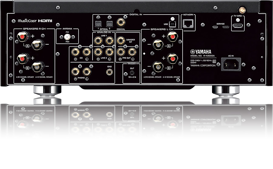Le Yamaha R-N2000A se distingue également par sa conception minutieuse. Son châssis renforcé, sa façade en aluminium, et ses pieds extra larges en argent ne sont pas seulement esthétiques ; ils contribuent à une stabilité accrue et à une réduction des vibrations, éléments clés pour une qualité sonore pure et sans altération.